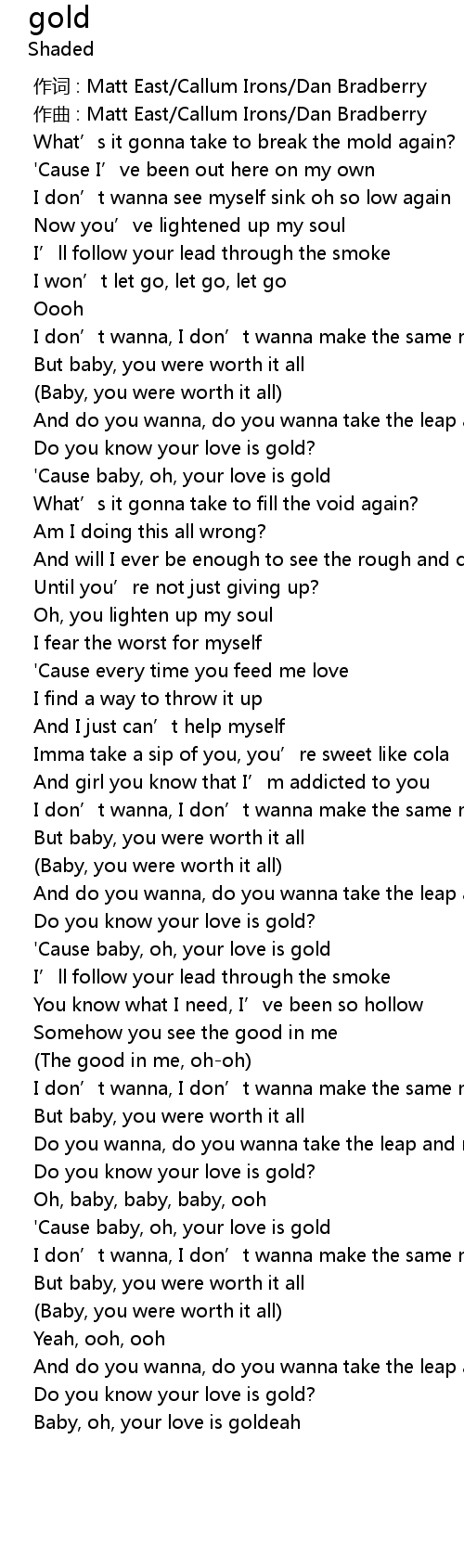 | [00:43.729] | ' Cause baby, oh, your love is gold |