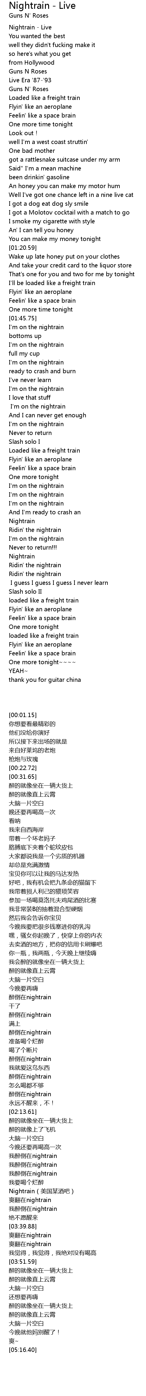 | [03:19.91] | 我醉倒在nightrain |