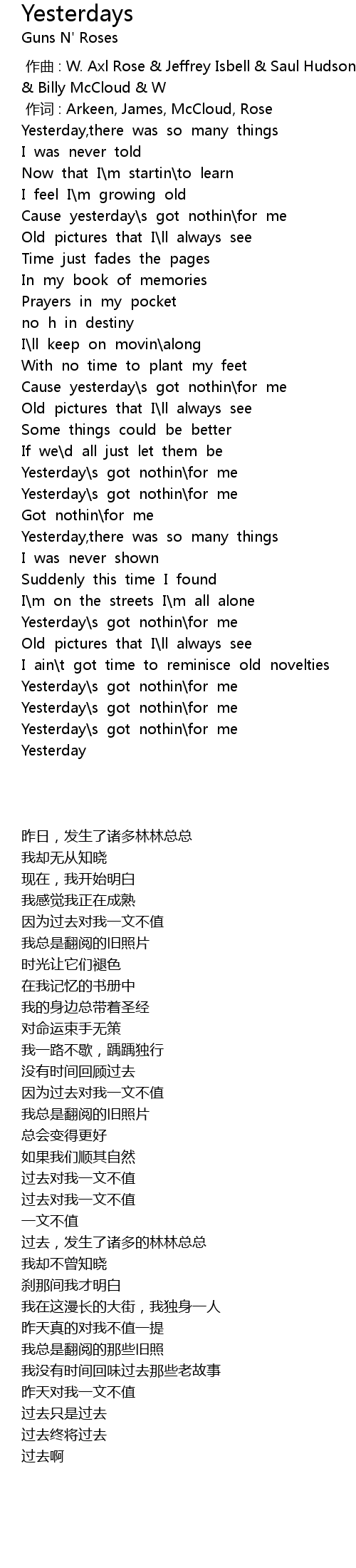 | [00:00.00] | 作曲 : W. Axl Rose & Jeffrey Isbell & Saul Hudson & Michael McKagan & Billy McCloud & W |