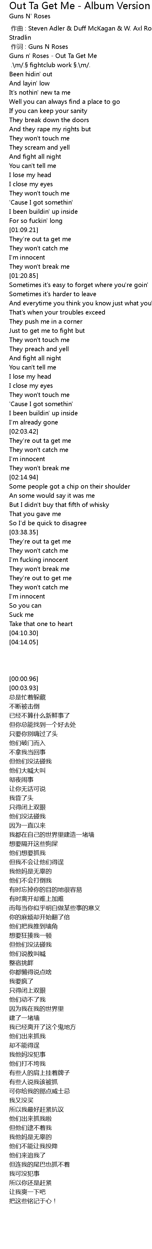 | [00:00.96] | Guns n' Roses - Out Ta Get Me |