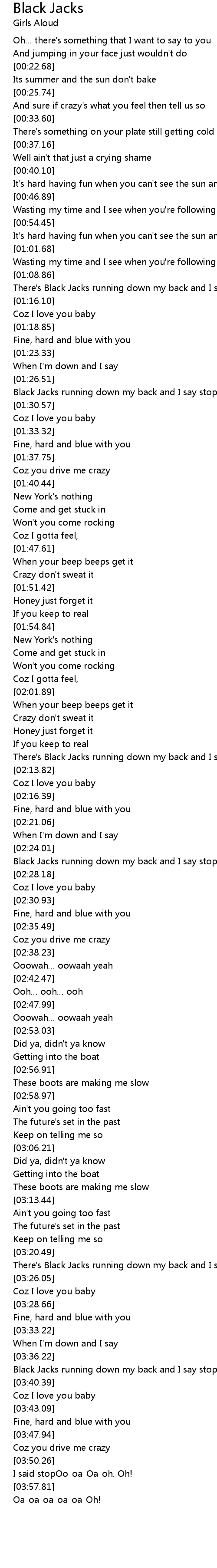 | [03:22.00] | There's Black Jacks running down my back and I say stop |