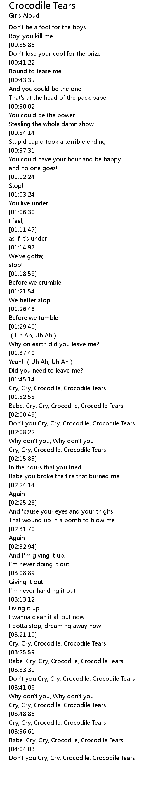 | [02:03.10] | Don't you Cry, Cry, Crocodile, Crocodile Tears |