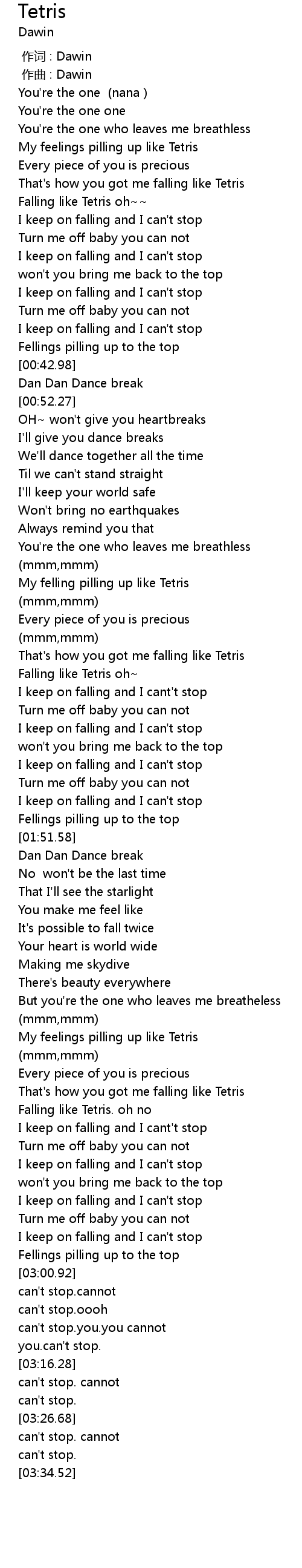 | [00:22.50] | Falling like Tetris oh~~ |