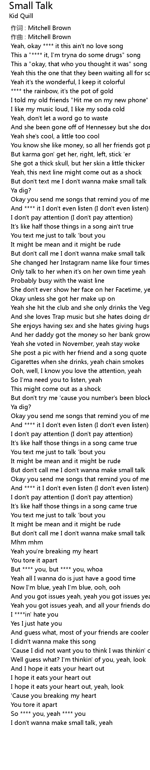 | [02:01.905] | But don' t call me I don' t wanna make small talk |