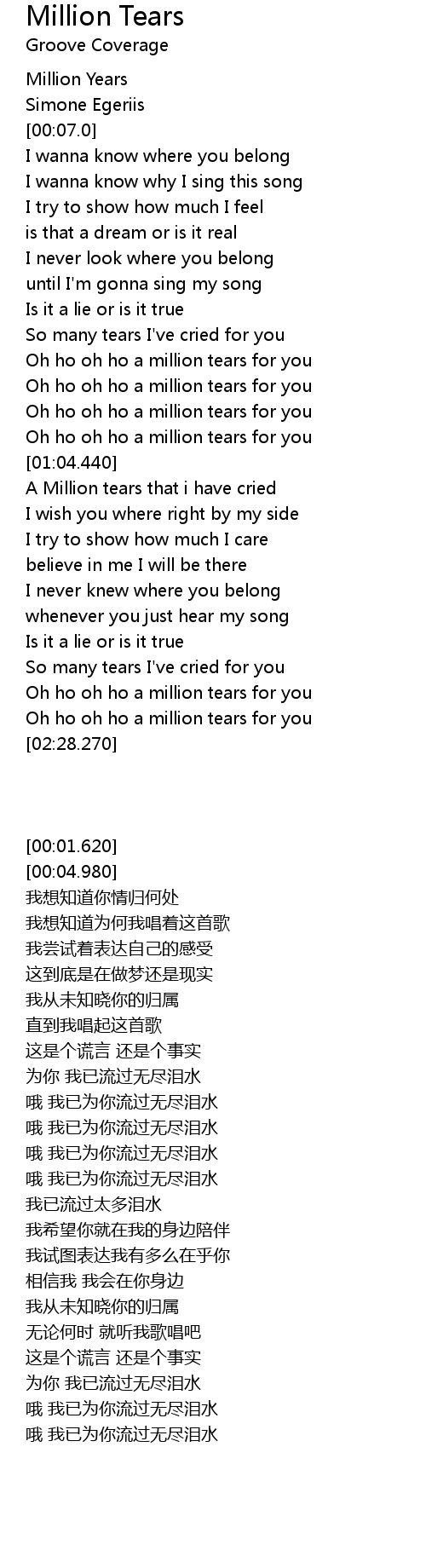 | [00:38.100] | Oh ho oh ho a million tears for you |