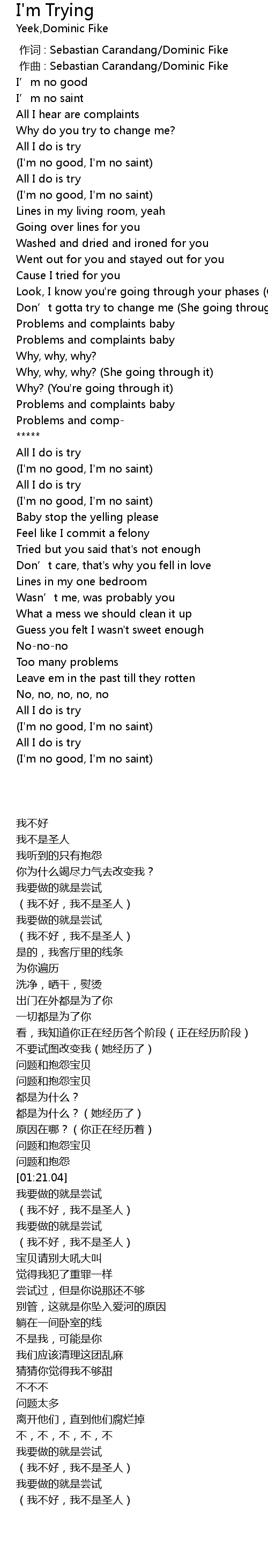 | [01:27.21] | (I'm no good, I'm no saint) |