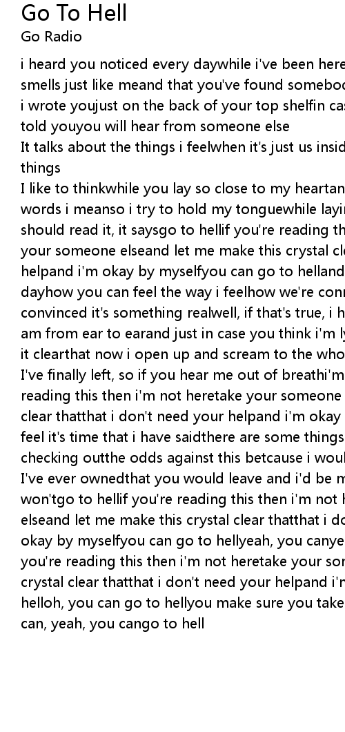 I've ever ownedthat you would leave and i'd be missing you like hellbut i won'tgo to hellif you're reading this then i'm not heretake your somebody elseand let me make this crystal clear thatthat i don't need your helpand i'm okay by myselfyou can go to hellyeah, you canyeah, you can, you cango to hellif you're reading this then i'm not heretake your somebody elseand let me make this crystal clear thatthat i don't need your helpand i'm okay by myselfyou can go to helloh, you can go to hellyou make sure you take someone elseoh, you know, you can, yeah, you cango to hell |