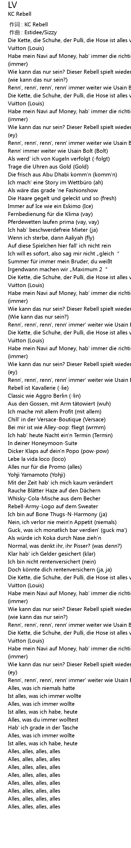 | [02:37.114] | Die Kette, die Schuhe, der Pulli, die Hose ist alles von Louis Vuitton Louis |