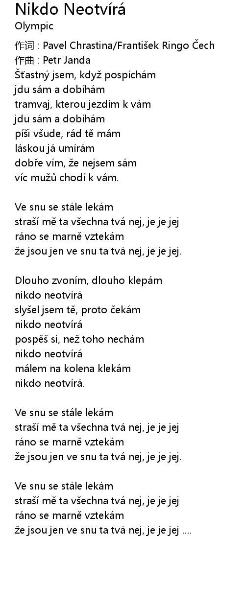 | 歌曲 | Nikdo Neotvírá |