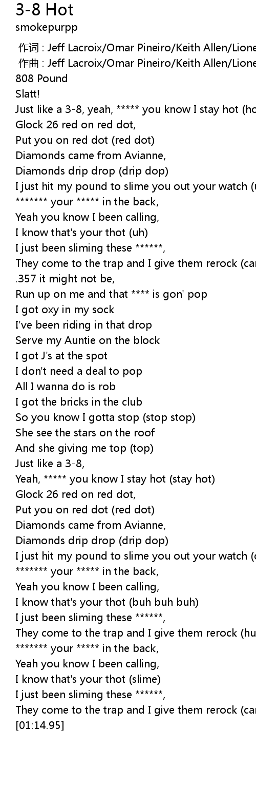 | [00:12.27] | Just like a 3-8, yeah, ***** you know I stay hot (hot) |