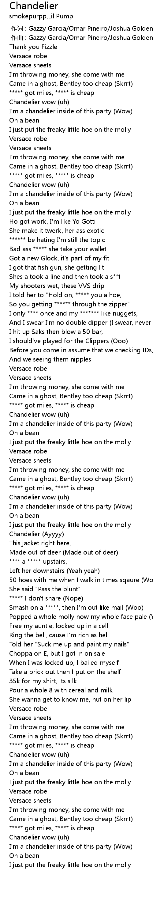 | [00:14.28] | I'm a chandelier inside of this party (Wow) |