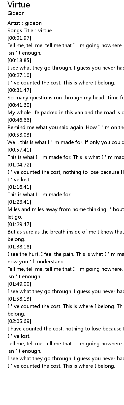 | [02:00.13] | I've counted the cost. This is where I belong. This is where I belong. |