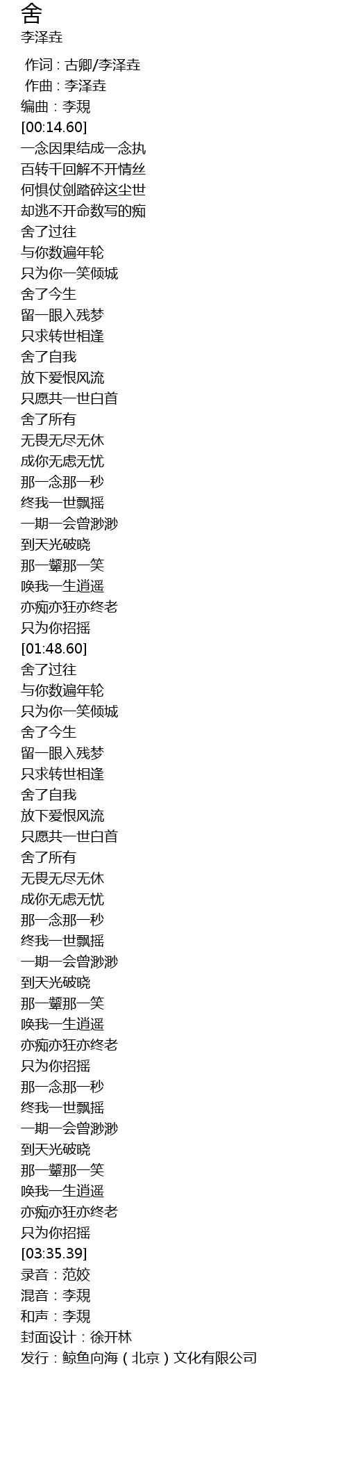 | [03:39.09] | 发行:鲸鱼向海(北京)文化有限公司 |