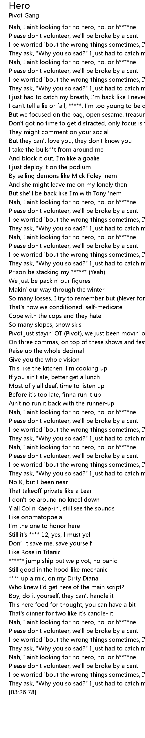 | [02:03.28] | Nah, I ain' t looking for no hero, no, or h ne |