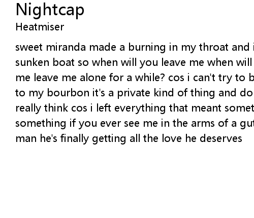sweet miranda made a burning in my throat and i'm slumped in the bathtub like a sunken boat so when will you leave me when will you leave me when will you leave me leave me alone for a while? cos i can't try to be happy without you leave me to my bourbon it's a private kind of thing and don't bother to tell me what you really think cos i left everything that meant something so i could become something if you ever see me in the arms of a gutter out in the 'burbs just say man he's finally getting all the love he deserves |