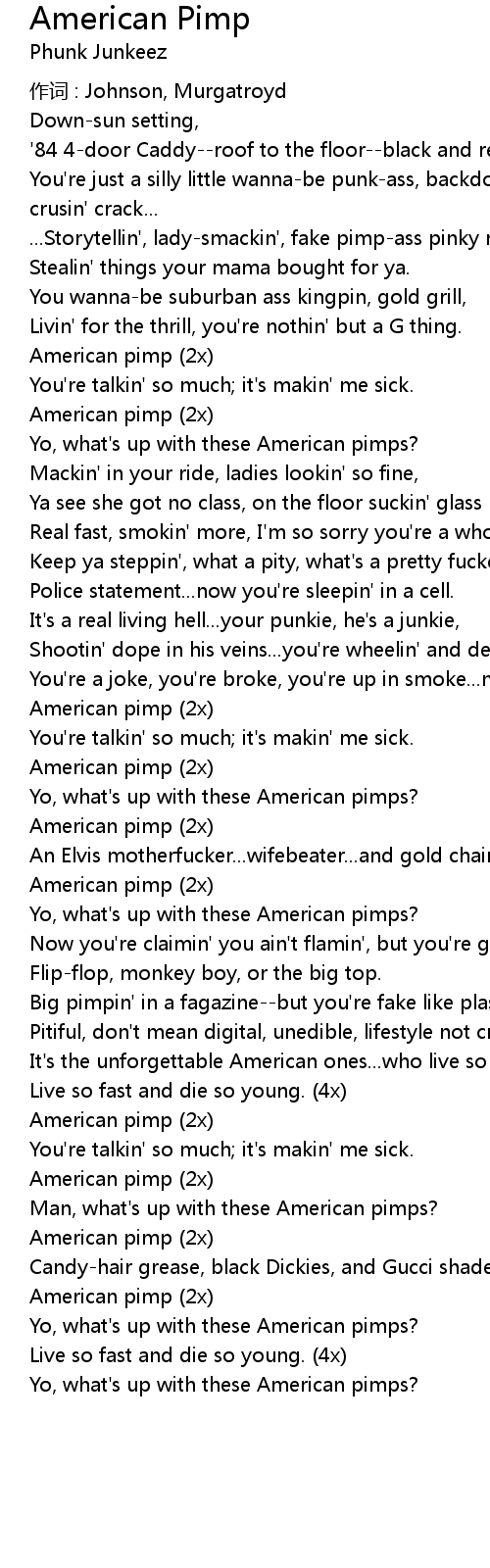 | Big pimpin' in a fagazinebut you' re fake like plastic cellophane limosuines. | |