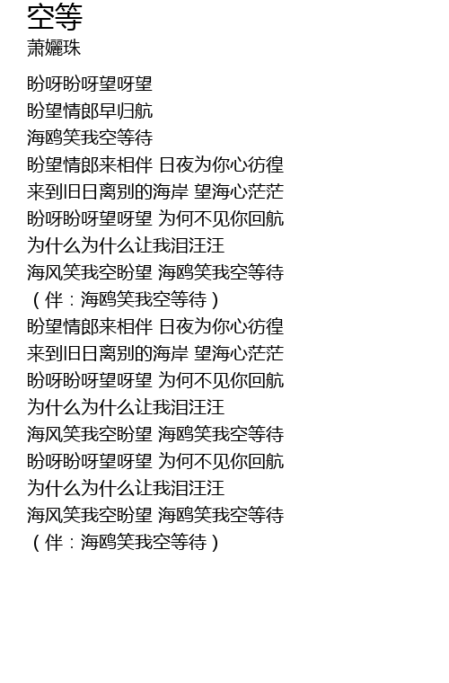 | [00:22.199] | hǎi ōu xiào wǒ kōng děng dài |