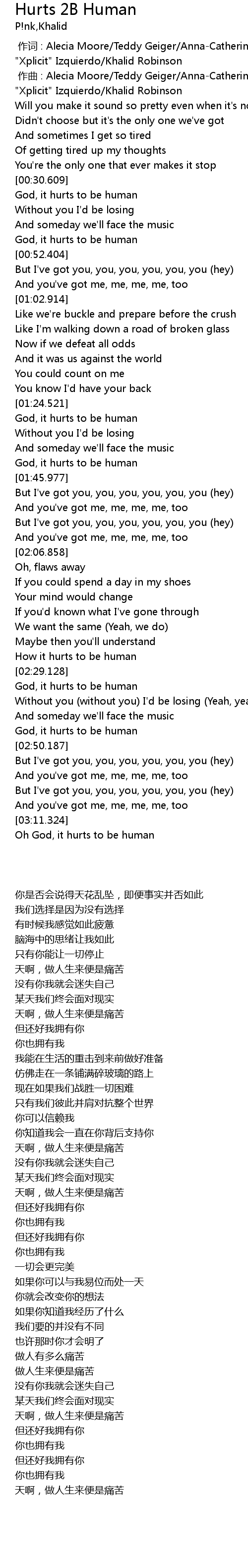 | [00:00.000] | 作词 : Alecia Moore/Teddy Geiger/Anna-Catherine Hartley/Alexander "Xplicit" Izquierdo/Khalid Robinson |