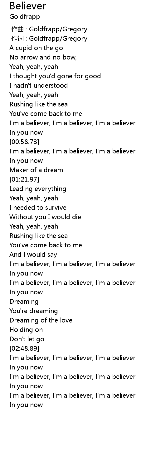 | [01:58.64] | I' m a believer, I' m a believer, I' m a believer |