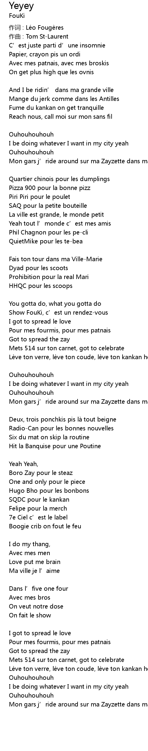 | Mon gars j’ride around sur ma Zayzette dans ma city yeah | |
