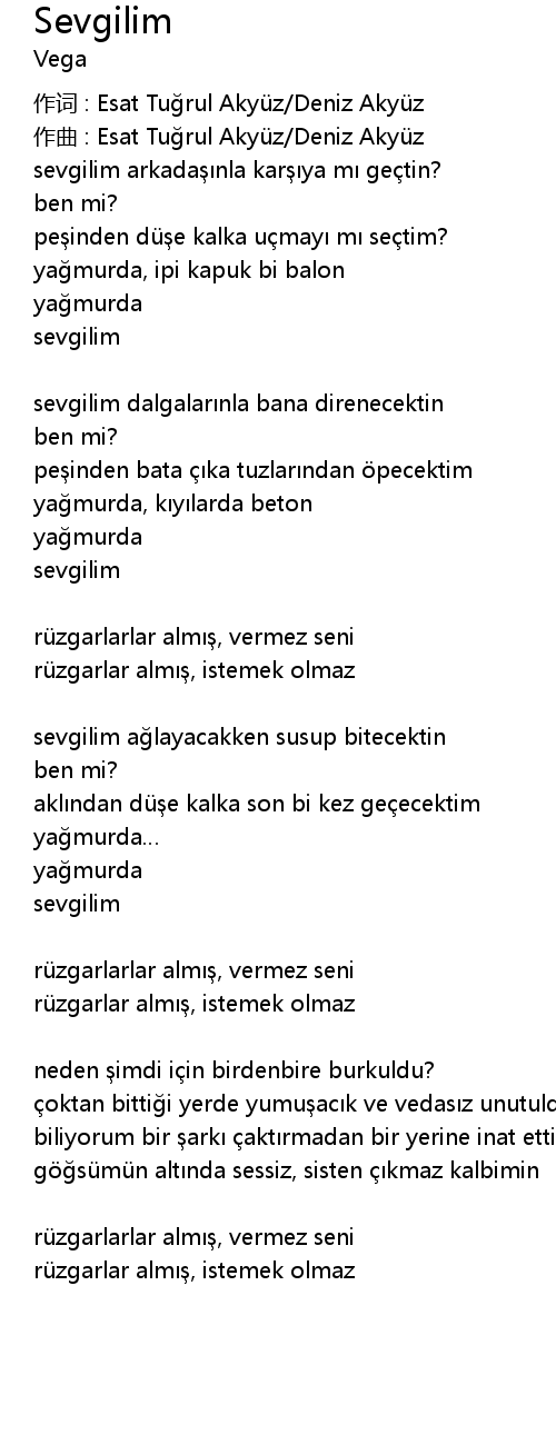 | 作词 : Esat Tuğrul Akyüz/Deniz Akyüz | |