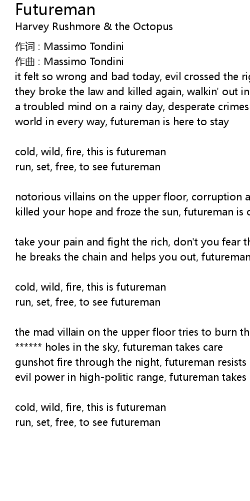 | notorious villains on the upper floor, corruption and bribery closed the door, killed your hope and froze the sun, futureman is on a lonely run | |