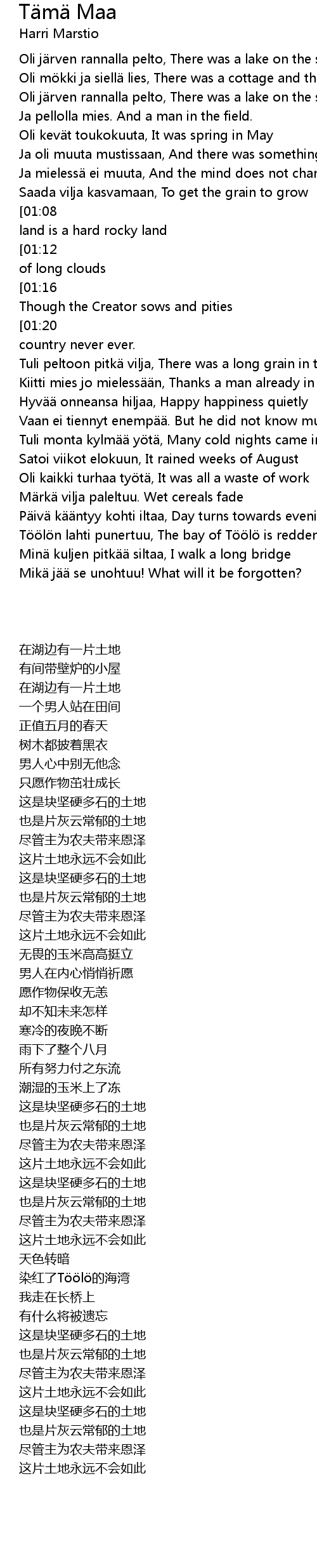 | [00:52][01:08][02:03][02:19][03:17][03:33] | T m maa on kova kivinen maa, This land is a hard rocky land |