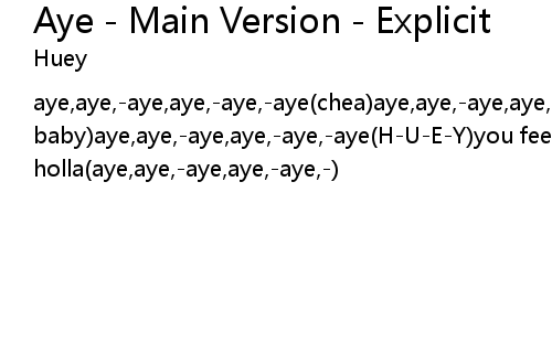 aye,aye,-aye,aye,-aye,-aye(chea)aye,aye,-aye,aye,-aye,-aye(wad up i see you baby)aye,aye,-aye,aye,-aye,-aye(H-U-E-Y)you feelin good go on holla(aye,aye,-aye,aye,-aye,-)