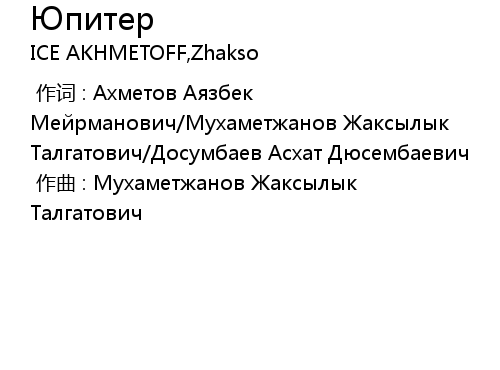 | [00:00.000] | 作词 : Ахметов Аязбек Мейрманович/Мухаметжанов Жаксылык Талгатович/Досумбаев Асхат Дюсембаевич |