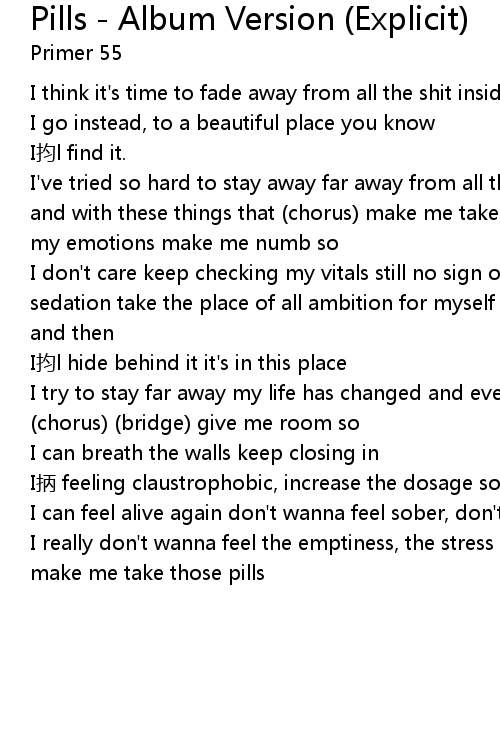 | I've tried so hard to stay away far away from all these days that never change and with these things that (chorus) make me take those pills (oh yea) amputating my emotions make me numb so | |