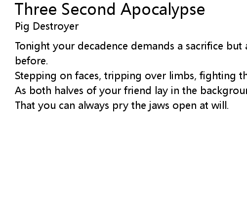 | Tonight your decadence demands a sacrifice but attrition never slowed you before. | |