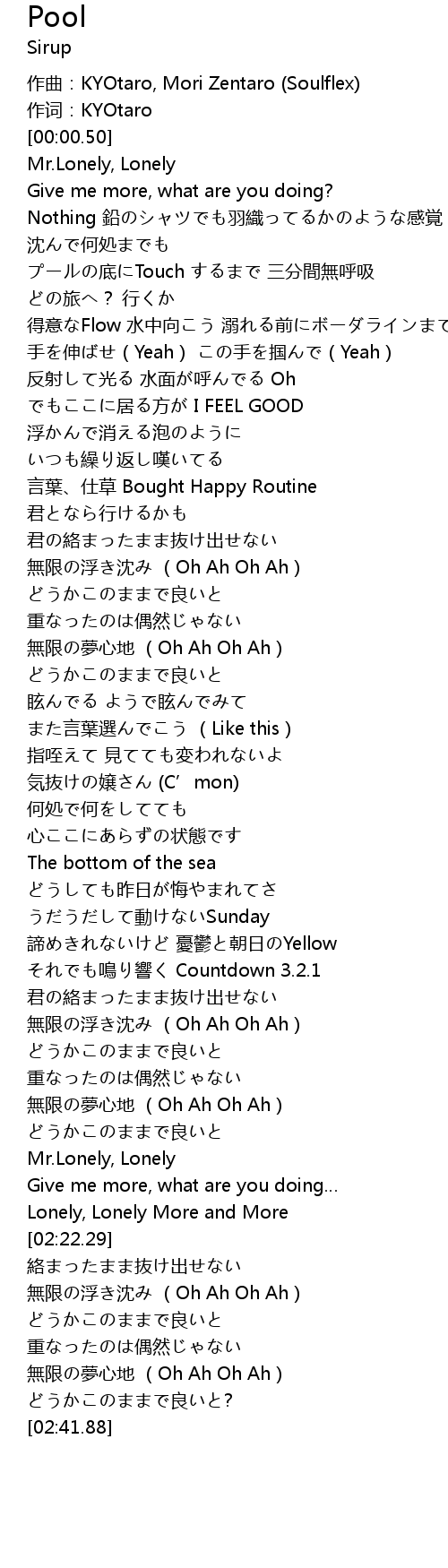 | [00:22.36] | プールの底にTouch するまで 三分間無呼吸 どの旅へ? 行くか |