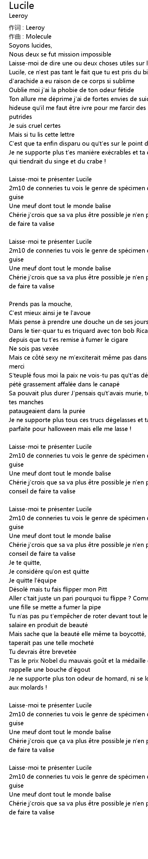 | Ton allure me de prime j' ai de fortes envies de suicide t' es devenue tellement hideuse qu' il me faut tre ivre pour me farcir des effluves de se cre tions putrides | |