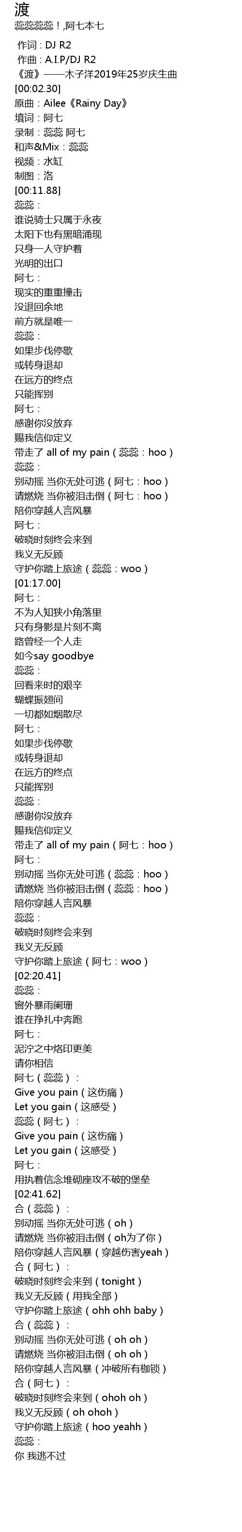 | [00:00.00] | 《渡》——木子洋2019年25岁庆生曲 |