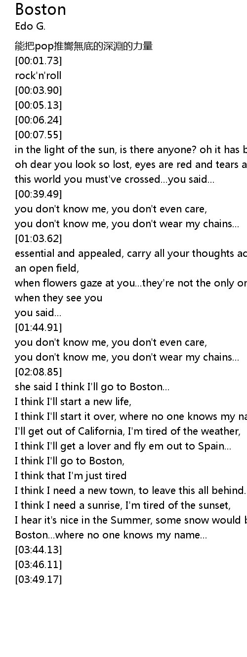| [03:01.59] | Boston... where no one knows my name... |