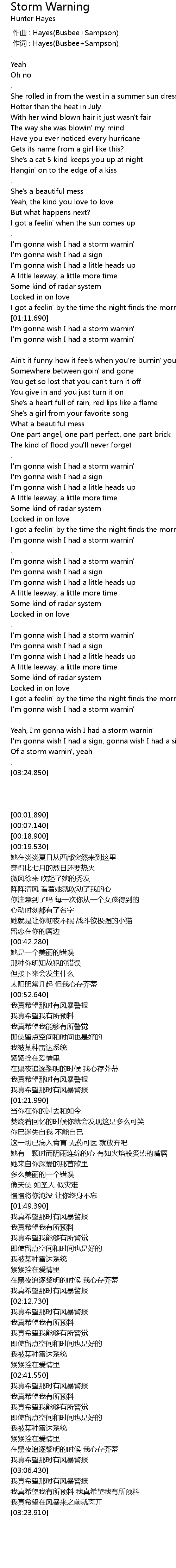 | [03:19.890] | Of a storm warnin', yeah |