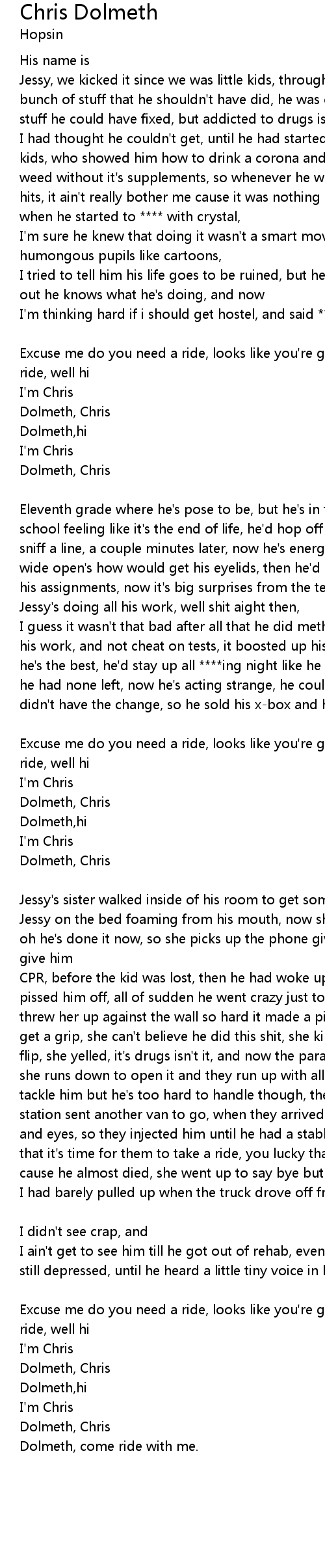 I guess it wasn't that bad after all that he did meth, it made him actually do his work, and not cheat on tests, it boosted up his confidence, he felt like he's the best, he'd stay up all ****ing night like he don't need to rest, until he had none left, now he's acting strange, he couldn't buy anymore, cause he didn't have the change, so he sold his x-box and his whole rack of games, |