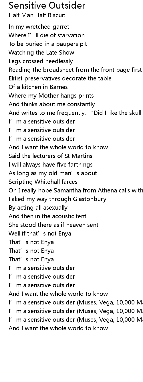 | I’m a sensitive outsider (Muses, Vega, 10,000 Maniacs) | |