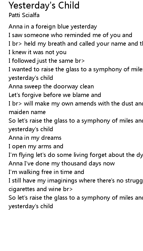 | I wanted to raise the glass to a symphony of miles and say our last farewell to yesterday' s child | |