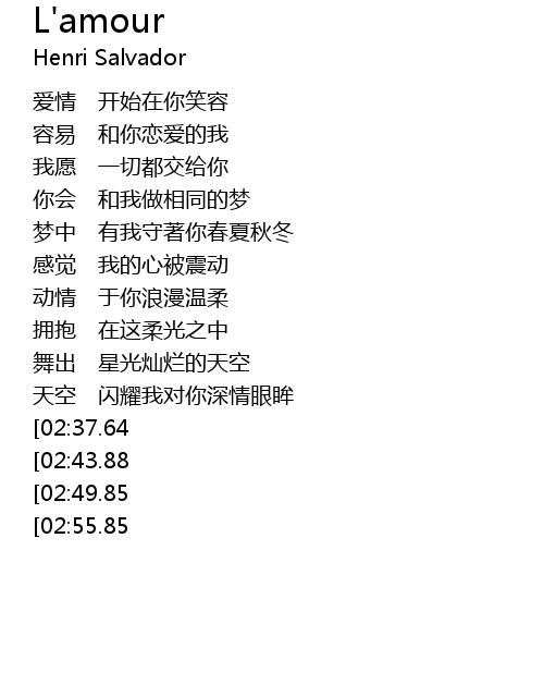 | [03:08.17][02:43.88][01:55.41][01:31.21] | LA' MOUR he ni jin jin xiang yong |