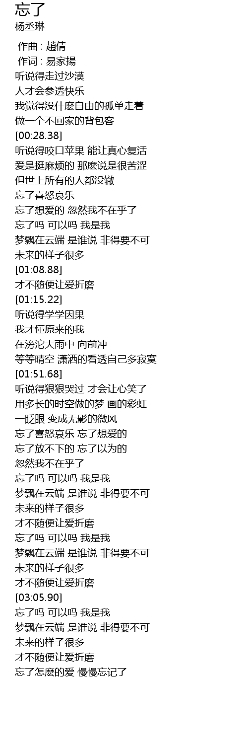 | [02:19.20] | 忘了放不下的 忘了以为的 |