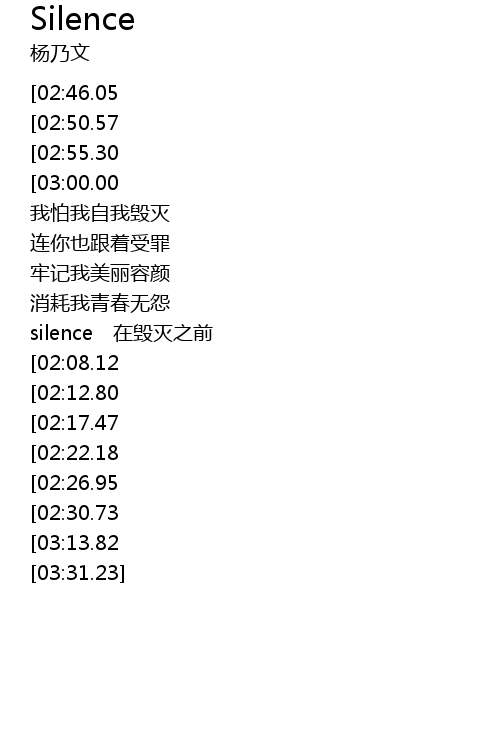 | [03:04.48][03:13.82][03:23.15] | silence bù xū yào yǔ yán |
