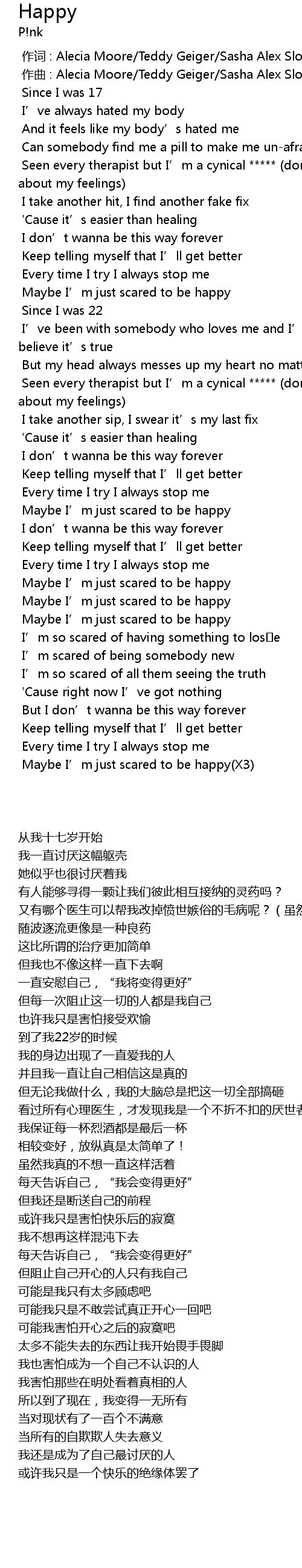 | [00:00.000] | 作词 : Alecia Moore/Teddy Geiger/Sasha Alex Sloan/Steph Jones |
