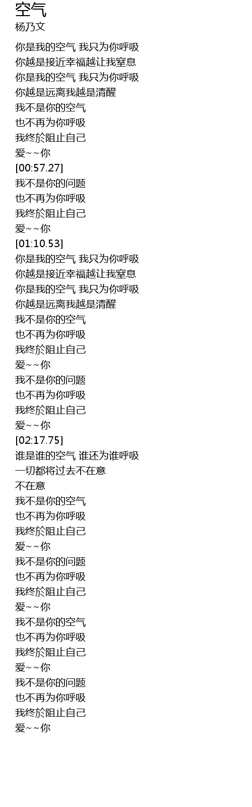 | [00:34.67] | 你是我的空气 我只为你呼吸 |