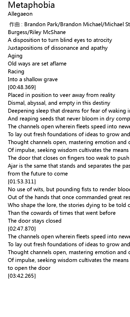 | [00:00.000] | zuo qu : Brandon Park Brandon Michael Michael Stancel Greg Burgess Riley McShane |