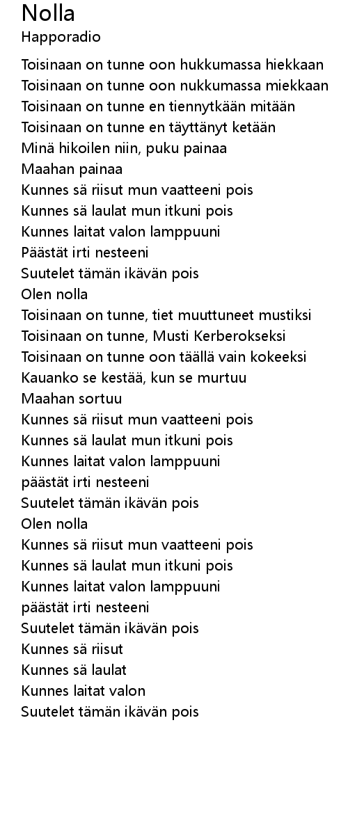 | Kunnes sä laulat mun itkuni pois | |