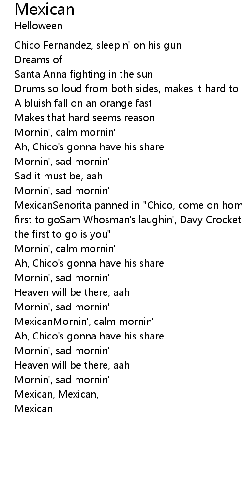 MexicanSenorita panned in "Chico, come on homeSanta Anna's losing, you'll be the first to goSam Whosman's laughin', Davy Crocket tooWhen Anna takes the Alamo, the first to go is you"