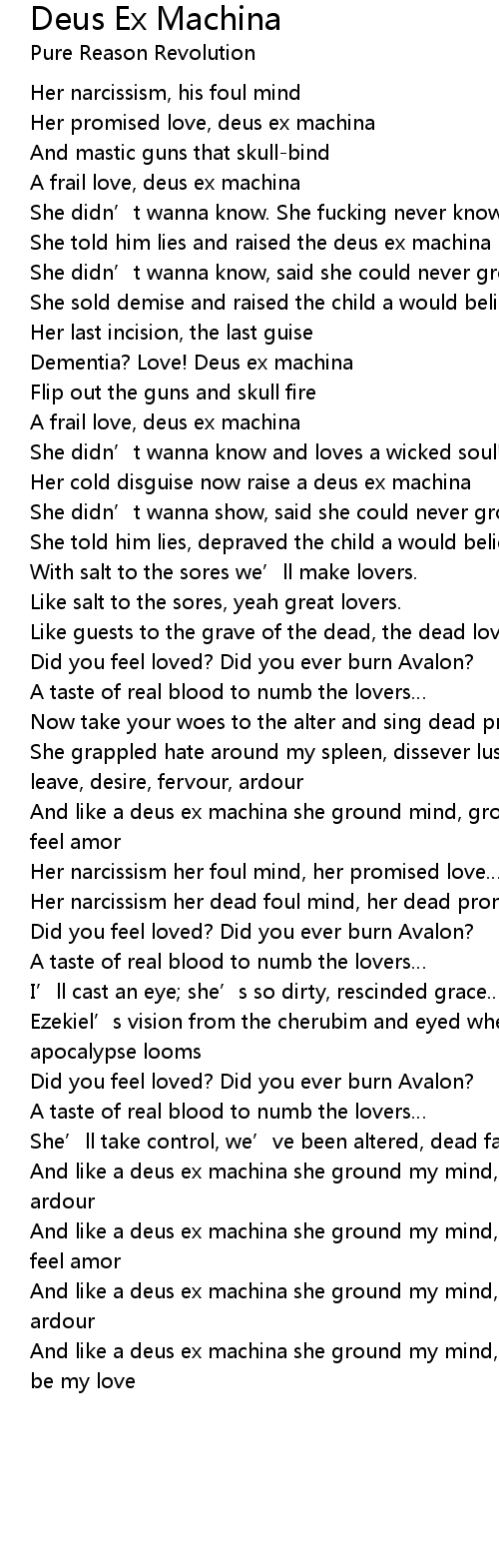 | And like a deus ex machina she ground my mind, growing clearer, you' ll always feel amor | |