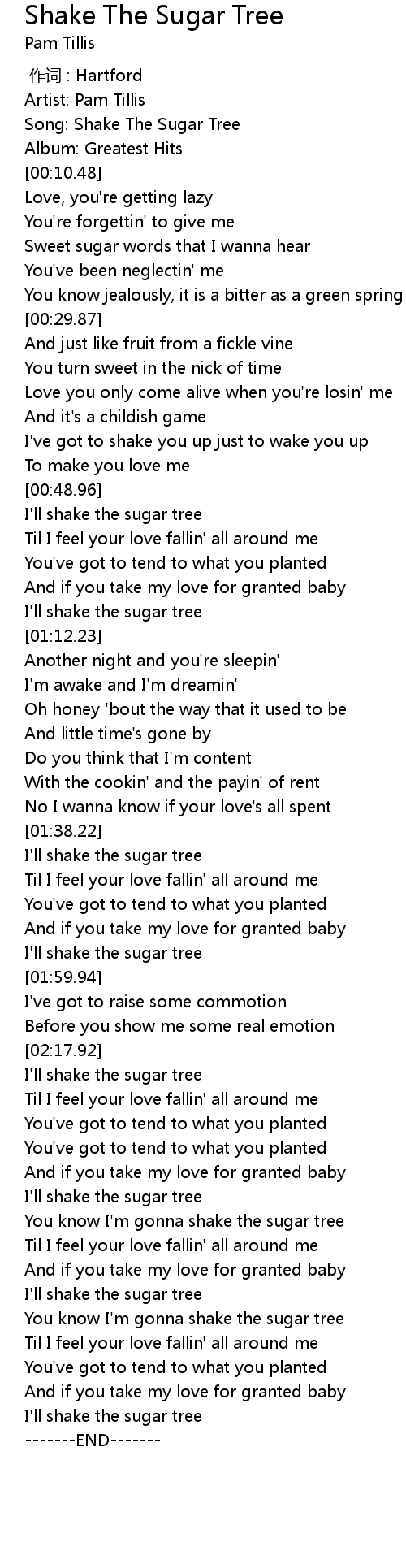 | [02:42.17] | You know I'm gonna shake the sugar tree |