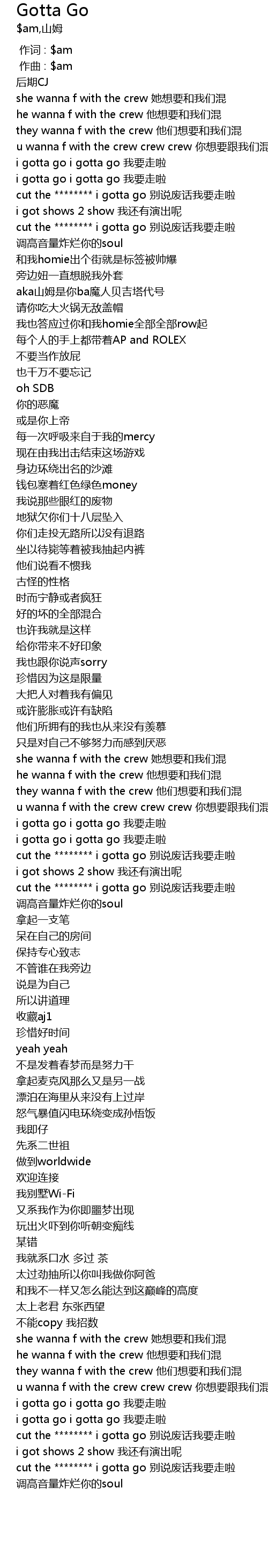| [01:47.372] | u wanna f with the crew crew crew nǐ xiǎng yào gēn wǒ men hùn |